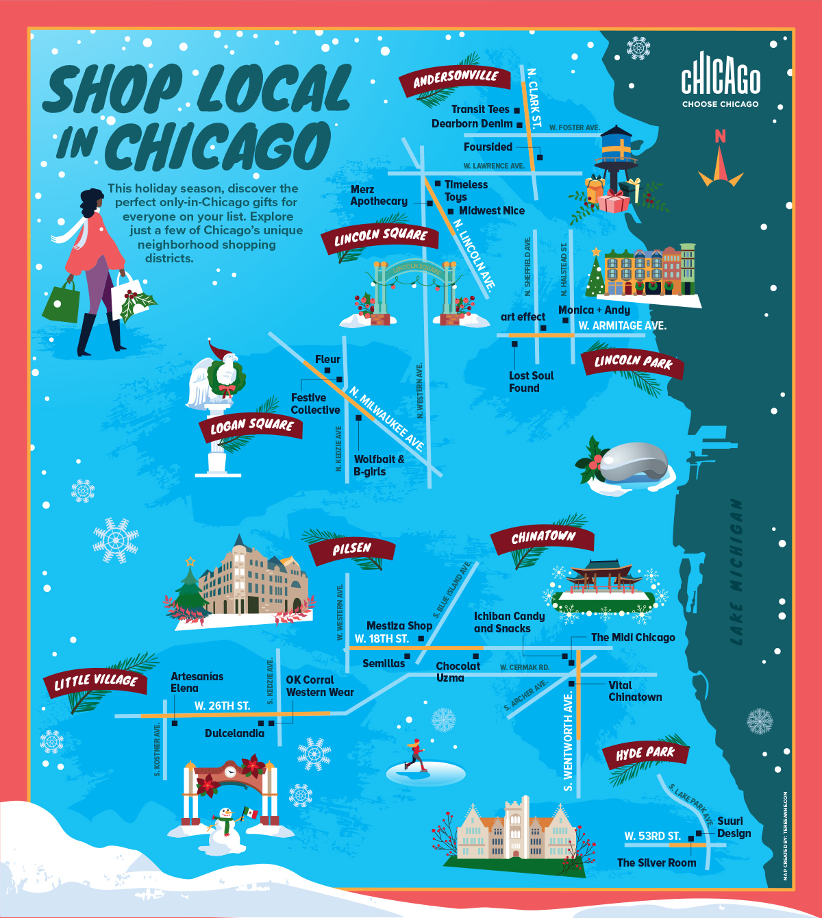 Discover unique boutiques, local makers, and hidden gems in Chicago’s charming neighborhood shopping districts. Our handy map will point you to just a few of the city’s top gift shopping destinations.